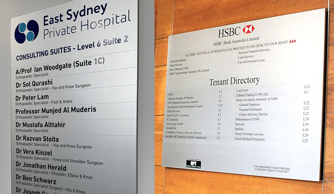 The primary function of the directory is to make it easy to navigate and easy to make changes when needed. We custom design the directory boards to suit your building or office, using the best materials available that are easy to maintain and make changes when required. We can make the slats in the directory boards to be magnetic which allows for easy changes as we supply blank slats while the old slat is being re-skinned with the new business name.
